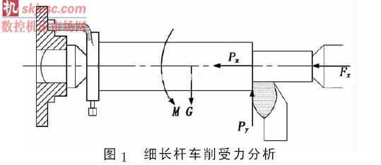 細(xì)長(zhǎng)桿車(chē)削受力分析如圖1所示。加工過(guò)程中,細(xì)長(zhǎng)桿件所受的外力主要有切削力(軸向切削力Px、徑向切削力Py及切向切削力Pz)、自身重力G、旋轉(zhuǎn)產(chǎn)生的離心力、軸向頂力Fx,這些力共同作用,導(dǎo)致桿件產(chǎn)生彎曲變形。桿件變形的最直接后果是產(chǎn)生振動(dòng),從而影響工件的圓柱度和表面粗糙度。一般來(lái)講,工件彎曲越大,車(chē)削時(shí)振動(dòng)越大,表面質(zhì)量精度也就越難保證。